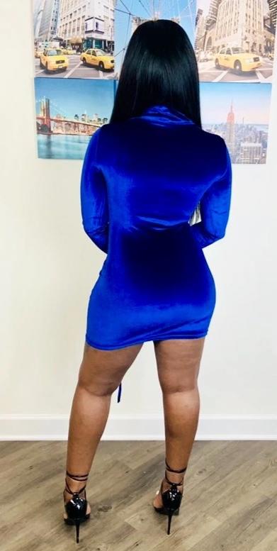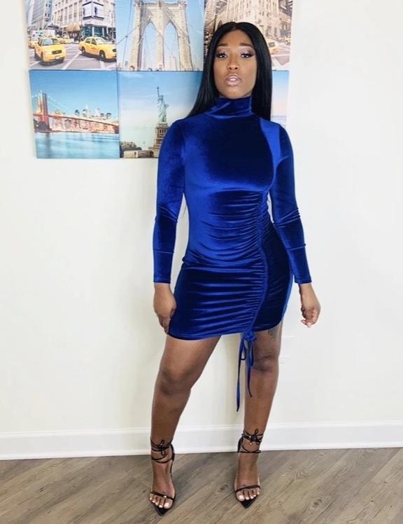 Blue Turtleneck Velvet Drawstring Hem Ruched Dress